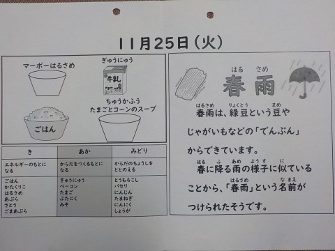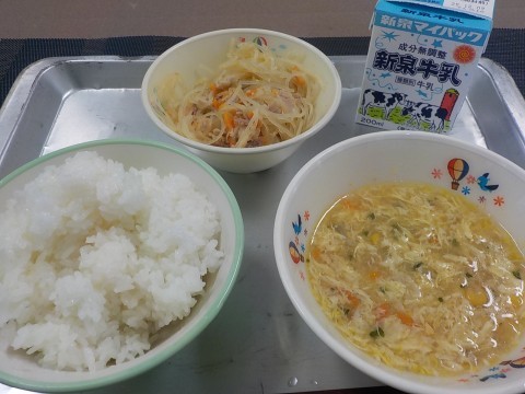 今日の献立は、ちゅうかふうたまごとコーンのスープ、マーボーはるさめ、ごはん、牛乳です。