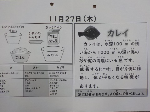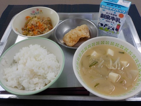 今日の献立は、みそしる、いとこんにゃくのうまに、かれいのからあげ、ごはん、牛乳です。