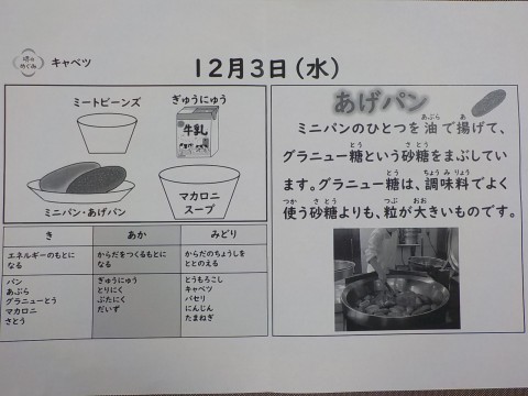 今日の献立は、マカロニスープ、ミートビーンズ、ミニパン・あげパン、牛乳です。