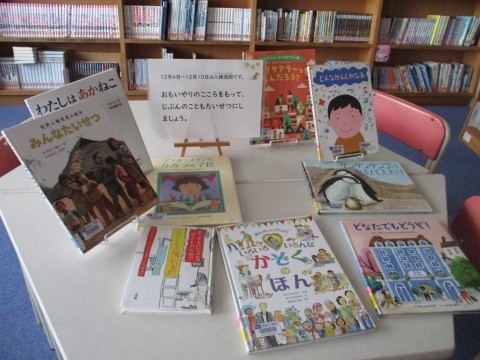 図書館には人権週間にあわせて,関連する本が展示されています。思いやりの心をもって友達も自分も大切にできたらいいですね。