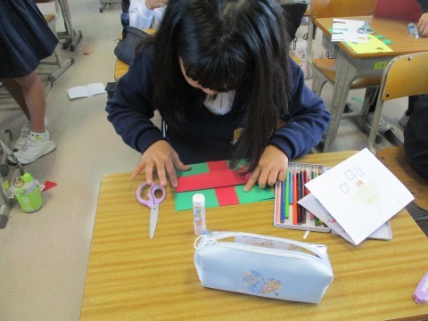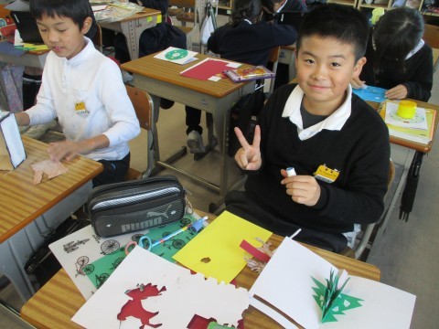 クリスマスカードをつくっています。飛び出すところを上手につくることができました。