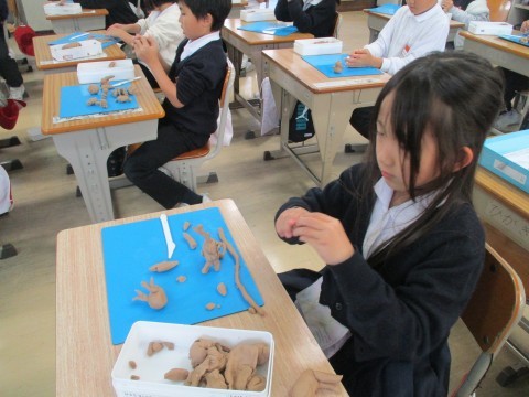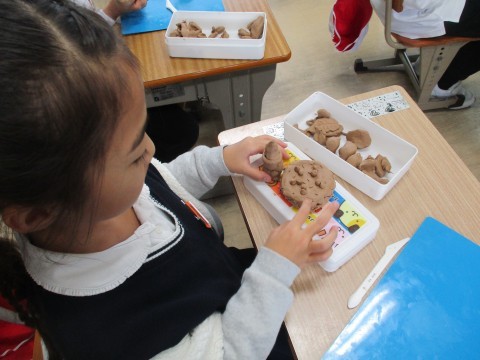ねんどで思い思いの作品をつくっています。クリスマスケーキ,サンタクロース,トナカイなど,クリスマスに関係するものも上手につくることができていました。