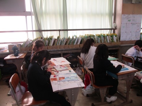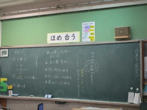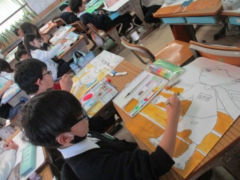 体育大会の絵に色を塗っています。水の量を多めに,同じ向きで塗っていくことがポイントです。