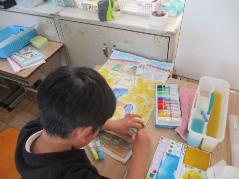 体育大会の絵に色をつけています。絵の具をうすめたり,重ねたり,立体的に塗ることができました。上手!