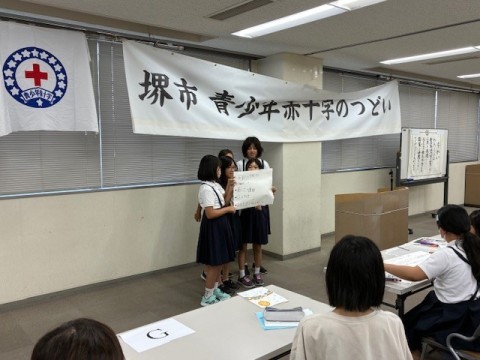 青少年赤十字は、昔ヨーロッパで第一次世界大戦が起こった時に、アメリカやカナダ、オーストラリアの子どもたちが自分たちでなにかできないだろうかと考え、学校の先生と相談して、戦争で困っているヨーロッパの子どもたちのために、自分たちの書いた作文や絵とともに学用品などを買うためのお金を集めて赤十字社に送りました。それがヨーロッパの子どもたちに届けられて、とても喜ばれたそうです。この活動がきっかけとなり、赤十字社の中に青少年赤十字が作られることになったということです。堺市立小学校では全校が青少年赤十字に加盟して、募金活動などに参加しています。
