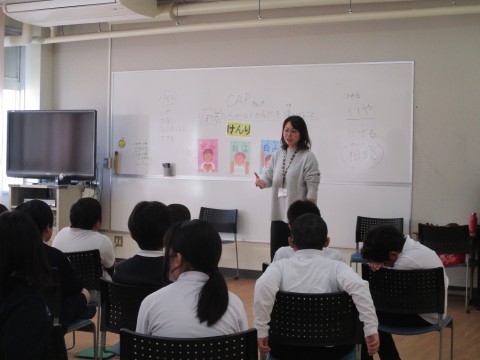 CAP出前授業です。子供たちが暴力から身を守るための予防教育プログラムで,安心・自信・自由の権利を伝え、具体的な対処法を教えてもらいました。