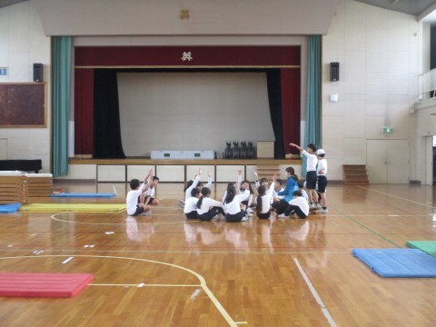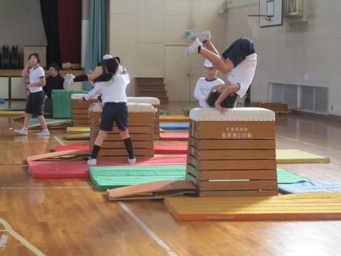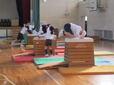 台上前転の練習をしました。勢いよく助走をつけて,跳び箱の手前に両手をつき,お尻を高く上げて頭の後ろから回ることがポイントです。友達同士でアドバイスもできていました。
