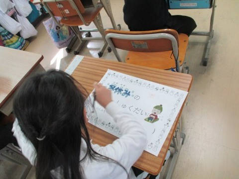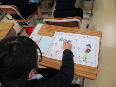 冬休みの宿題のイラストに,クリスマスや冬休みらしい色付けとお絵かきをしました。