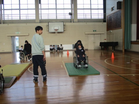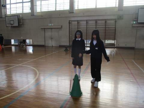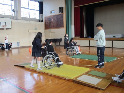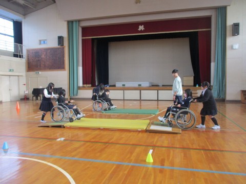 車椅子に乗ったり,押したり,白杖をもって目隠しをし,案内してもらったりして,キャップハンディ体験を行いました。