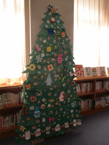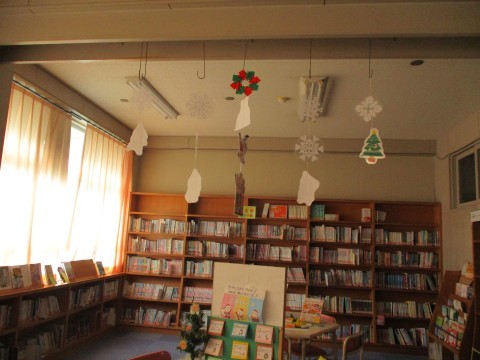 クリスマスの飾り付けと関連の本が並んでいます。図書ボランティアさんありがとうございます。