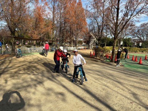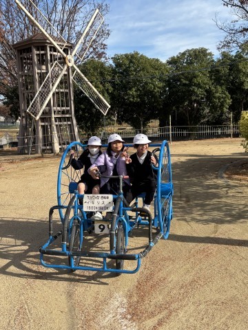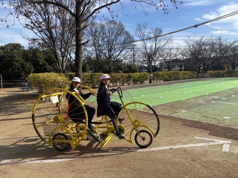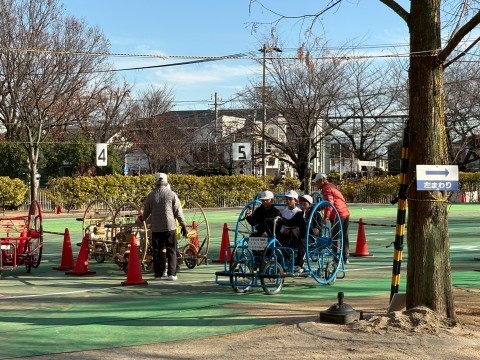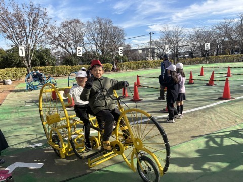 自転車広場では、普段乗れないような自転車に乗ることができました。普段とは違うペダルやハンドルで、操作は少し難しかったですが、友達と協力して上手に乗れていました。