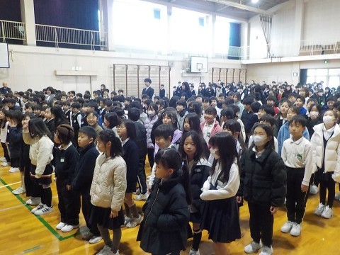 3学期の始業式を行いました。初めに元気よく校歌を歌ったあと,校長先生の話を聞きました。次に,転入生と4~6年生の理科を担当する新しい先生の紹介がありました。続いて,生徒指導の先生から3学期の学校生活についての話があり,最後に1年生の先生から1月の生活目標「ベル着をしよう」の話がありました。