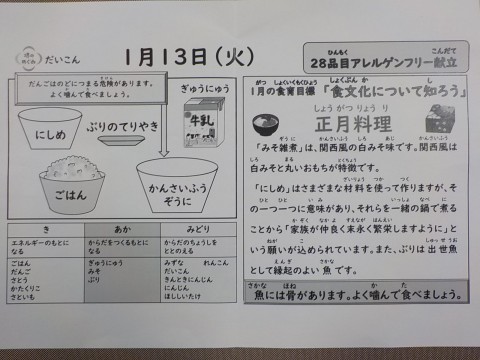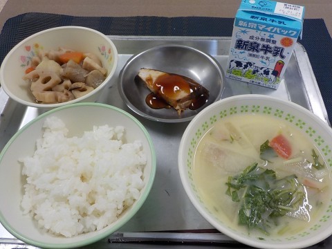今日の献立は、かんさいふうぞうに、にしめ、ぶりのてりやき、ごはん、牛乳です。