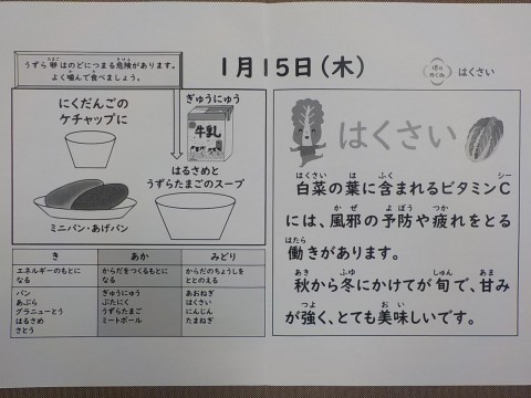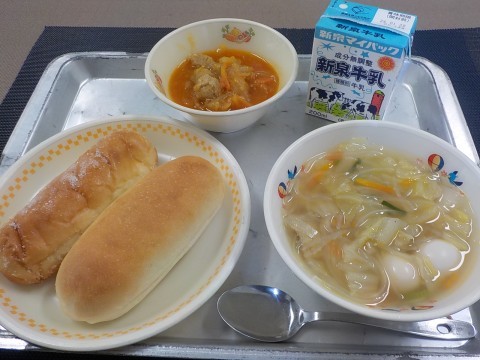 今日の献立は、はるさめとうずらたまごのスープ、にくだんごのケチャップに、ミニパン・あげパン、牛乳です。