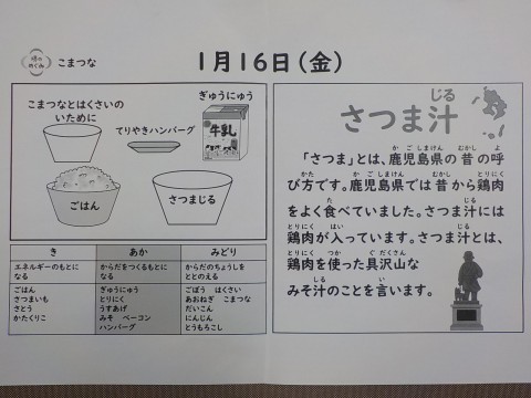 今日の献立は、さつまじる、こまつなとはくさいのいために、てりやきハンバーク、ごはん、牛乳です。