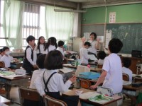 新出漢字のそらがきをしているところです。何画目が中央を通る,など実際に書く時のポイントもおさえていました。