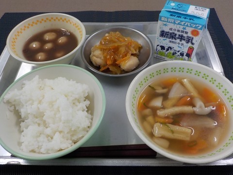 今日の献立は、のっぺいじる、とりからあげのやさいあんかけ、しらたまぜんざい、ごはん、牛乳です。