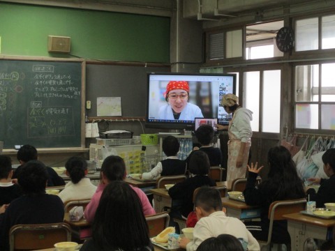 学校給食週間にちなんで,栄養教諭の先生によるTeamsを使ったオンライン授業が行われました。英彰小学校と新湊小学校をつないで,給食室の一日を知ることができました。