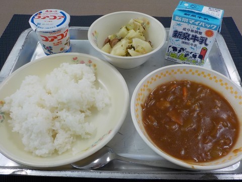 今日の献立は、ハヤシライス、じゃがいものチーズやき、ヨーグルト、ごはん、牛乳です。