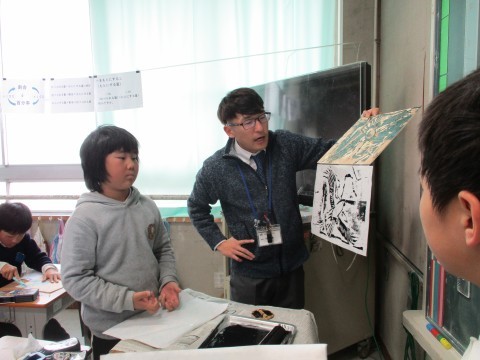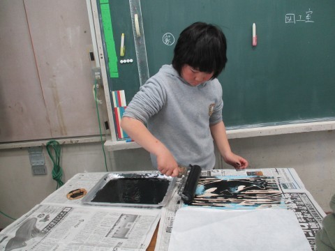 彩色版画をつくっています。彫刻刀で彫り終えて,いよいよ印刷へ。