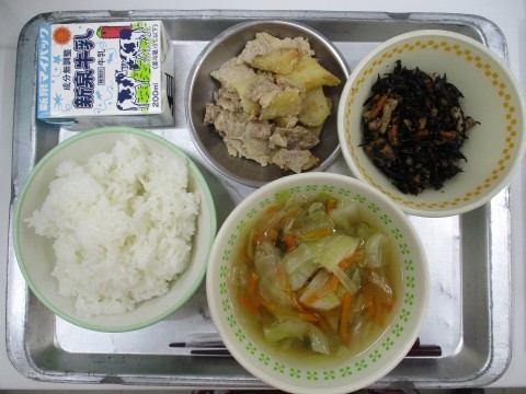 遅くなりましたが昨日の給食です。ごはん,牛乳,野菜たっぷりすまし汁,豚肉の味噌マヨガーリック焼き,ひじきの甘煮でした。