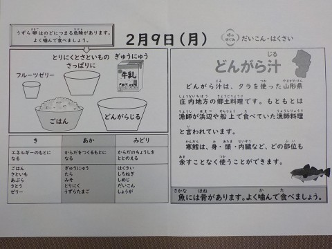 今日の献立は、どんがらじる、とりにくとさといものさっぱりに、ごはん、フルーツゼリー、牛乳です。
