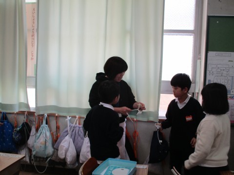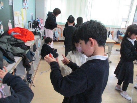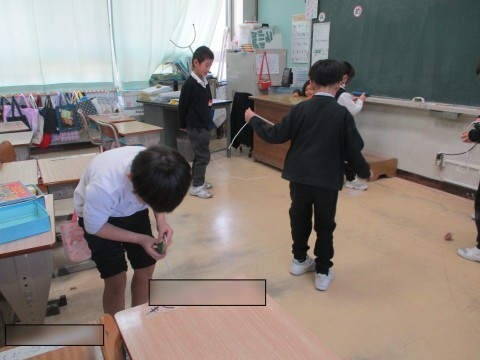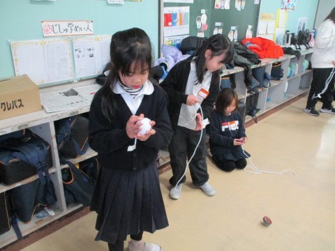 つくったこまをまわしています。こま名人のお友達に巻き方を教えてもらってみんな上手になりました。