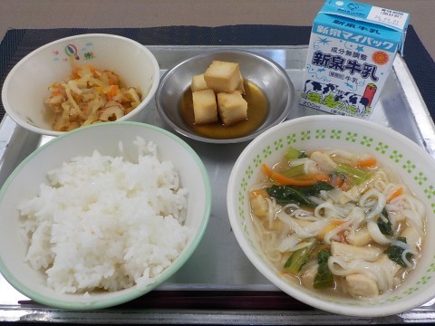 今日の献立は、ごもくにゅうめん、きりぼしだいこんのにもの、あつあげのしょうがやき、ごはん、牛乳です。