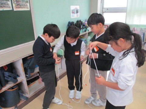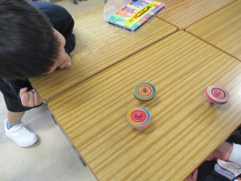 こまの回し方を教え合って練習しました。巻き始めがポイントです。