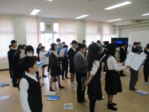 新多目的室で卒業式の合唱の練習です。今年は「最後のチャイム」も歌います。ソプラノとアルトのはもりがきれいになってきました。