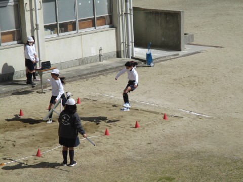 走り幅跳びを行いました。4年生までの幅跳びに助走がつきました。自分の記録をこえることを目標に走ります。