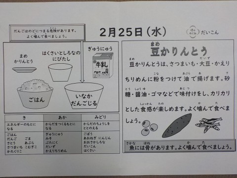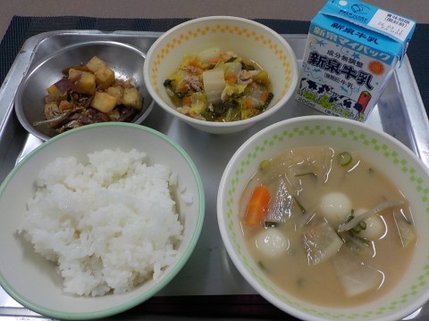 今日の献立は、いなかだんごじる、はくさいとしろなのにびたし、まめかりんとう、ごはん、牛乳です。