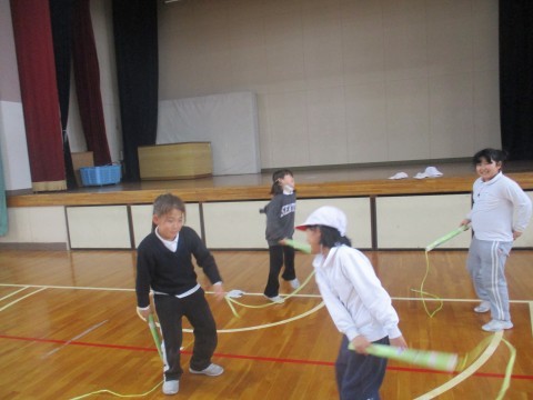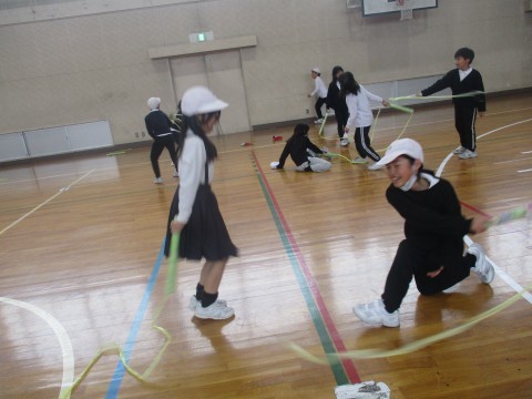 新聞とリボンで作った手具で体をいっぱい動かしている様子です。