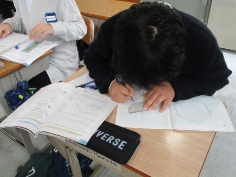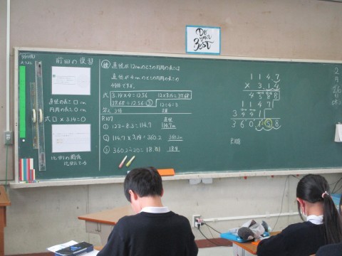 円周の長さの複合問題です。考え方を整理して,丁寧に計算しました。コンパスと分度器を使って,正五角形や正六角形を書くこともできるようになりました。