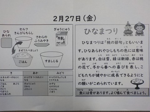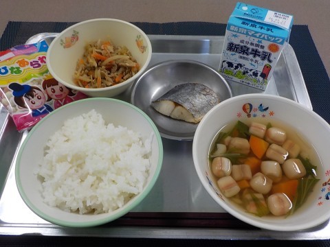 今日の献立は、すましじる、セルフきんぴらちらし、さわらのふうみやき、ひなあられ、ごはん、牛乳です。
