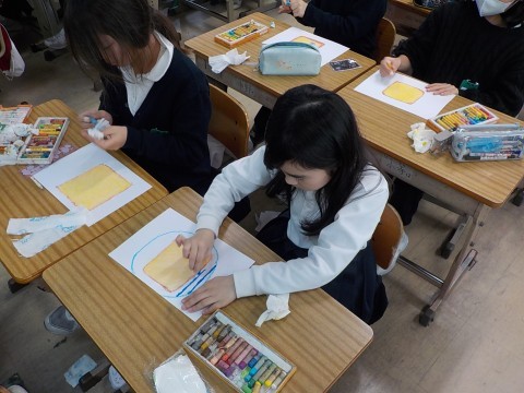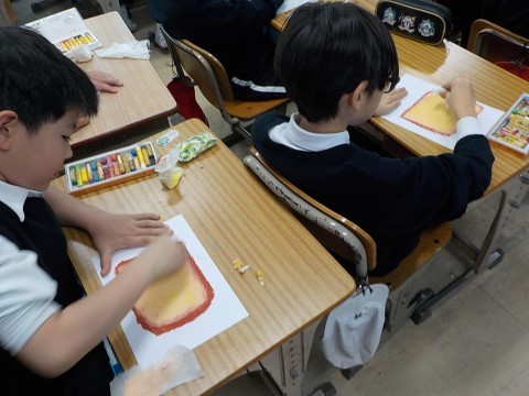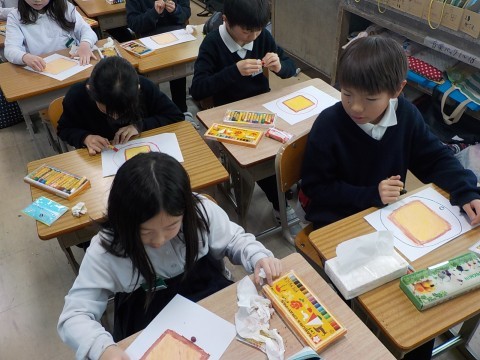イラストレーターの先生に来ていただき,クレヨンを使った絵の描き方を教わりました。おいしそうな食パンに目玉焼きなどをトッピングします。絵を描くことがますます好きになりますね。