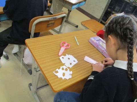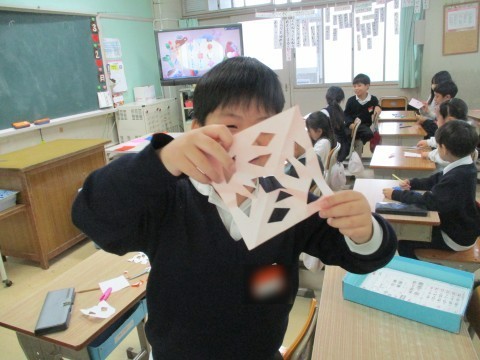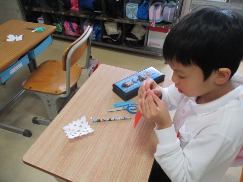 折り紙を折って折って切って・・飾り付けの完成です。