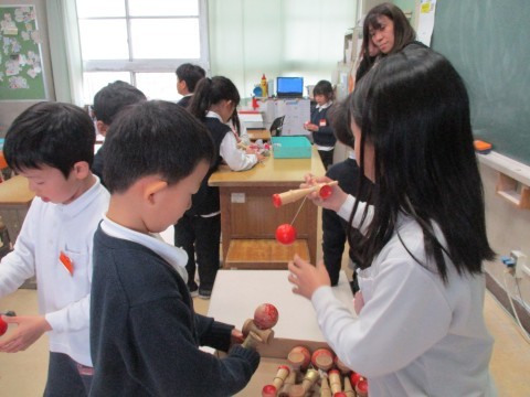 「もっしもっしカメよカメさんよ~」歌いながらお手玉とけん玉の練習をしていました。