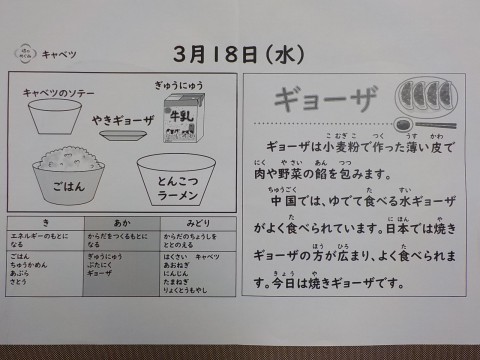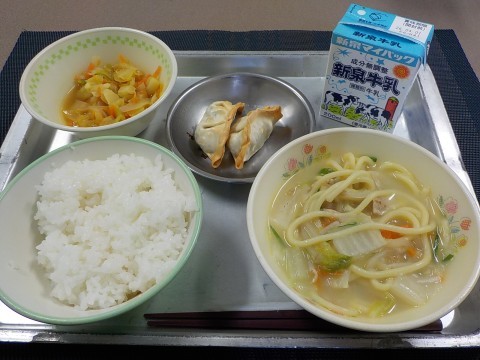 今日の献立は、とんこつラーメン、キャベツのソテー、やきギョーザ、ごはん、牛乳です。
