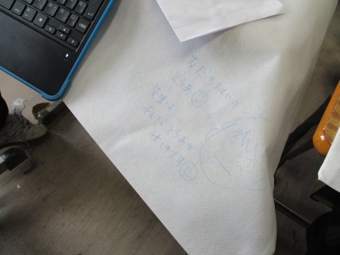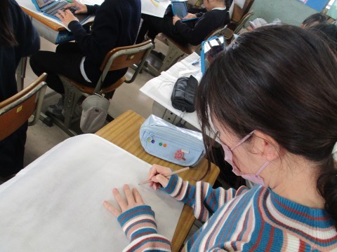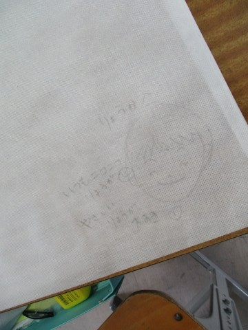一人一人の作品袋に似顔絵とメッセージを書いてまわっている担任の先生。このクラスで一緒に過ごす日も残り2日です。