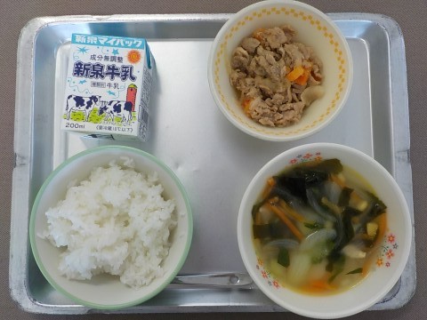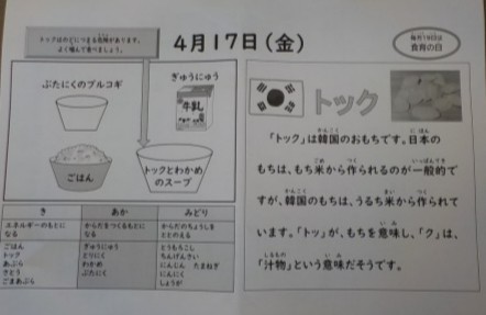 今日の献立はごはん・牛乳・トックとわかめのスープ・豚肉のプルコギです。参観に備えてしっかり食べましょう。
