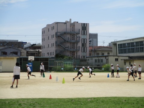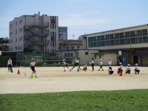 タッチコーンで速さを競っています。