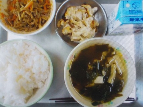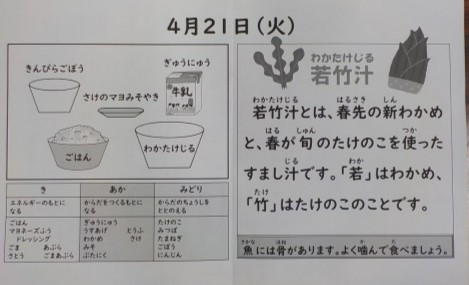 今日の献立はごはん・牛乳・鮭のマヨみそ焼き・きんぴらごぼう・若竹汁です。春らしいメニューです。