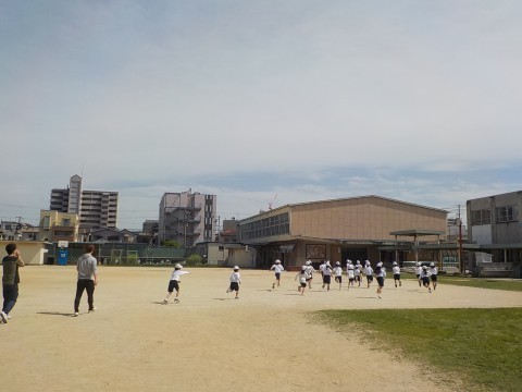 とっても気持ちいい天気です。運動場を先生と競走です。10秒のハンデをもらったのにあっという間にみんな抜かれてしまいました。