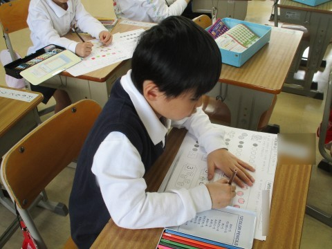 数の問題。正確に数えることができて,丁寧に色塗りもできて,一人ずつ先生にスタンプもらいました!