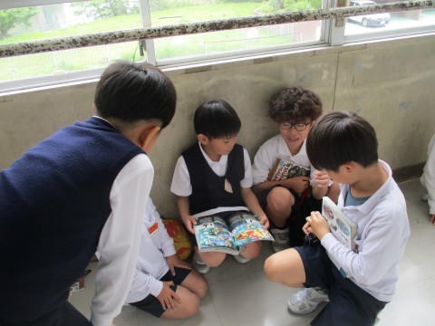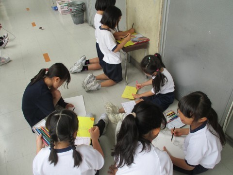 着替えの裏時間をつかって,廊下で友達と本を読んだり招待状の続きを書いたりしていました。短縮時間割の中,落ち着いて時間を有効につかうことができています。