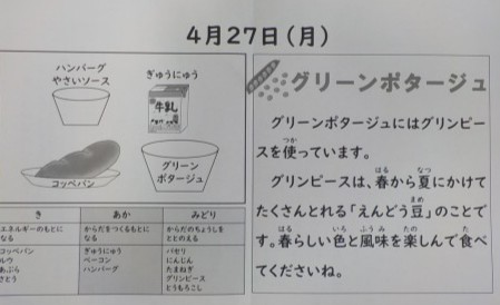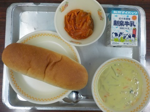 今日の献立はコッペパン・牛乳・グリーンポタージュ・ハンバーグ野菜ソースです。おかわりしている人も多かったです。