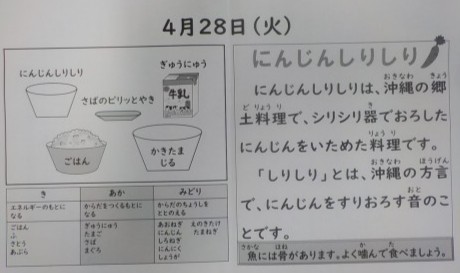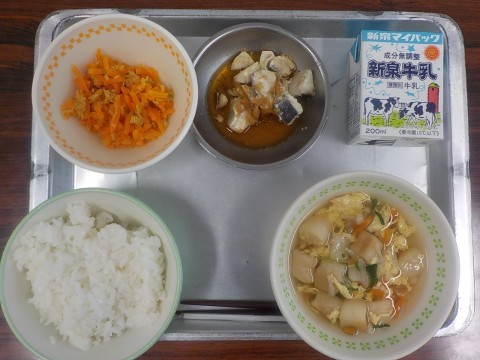 今日の献立はごはん・牛乳・かきたま汁・鯖のピリッと焼き・にんじんしりしりです。にんじんがとっても甘くておいしいです。