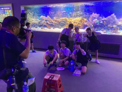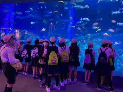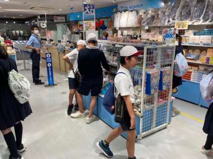水族館に入館しました。まずは、グループ写真、大水槽、ショップに分かれて行動です。