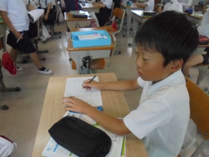 「生活見直し習慣」のカードへ記入していました。早寝ができたか、朝、時間通りに起きれたかを確認していました。体調管理をして、梅雨の時期を健康に過ごしましょう。体育では「ポートボール」の振り返りカードを書きました。「パスをまわせた!」と喜びの声も聞こえました。